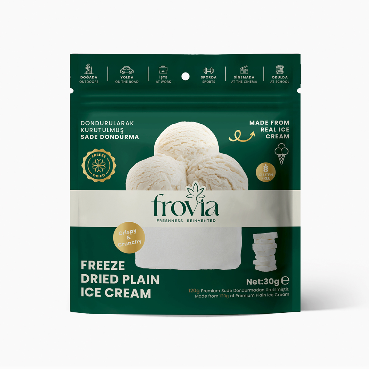 Frovia Freeze-Dried Sade Dondurma, gerçek sütlü dondurmanın özel olarak dondurulup vakum altında kurutulmasıyla üretilir. Freeze-dry teknolojisi sayesinde dondurmanın doğal süt aroması, hafif tatlı yapısı ve kremsi karakteri korunur; çıtır ve hafif bir forma dönüşür.
